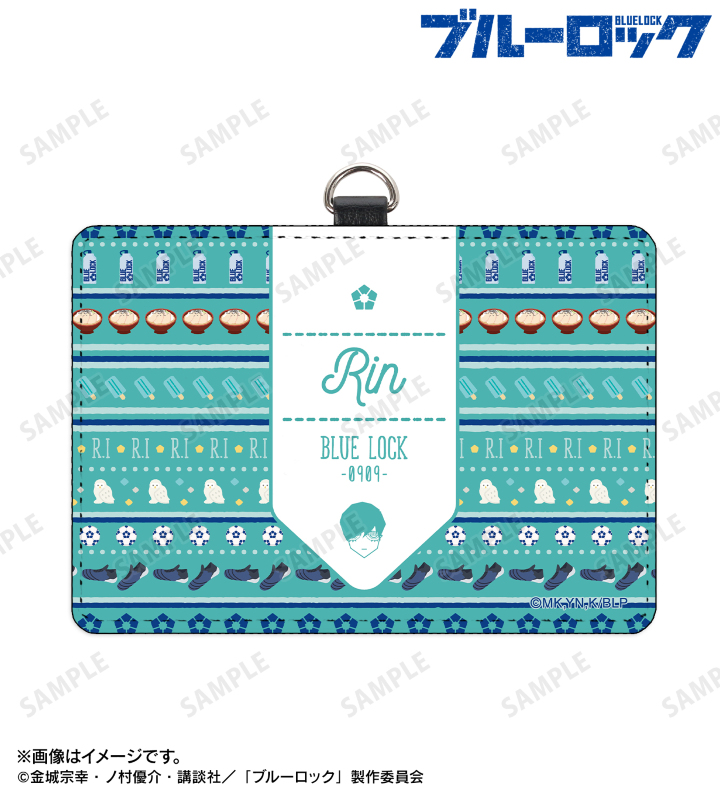 糸師 凛のイラスト、イニシャル、誕生日などのキャラクターや作品のモチーフを描き起こし、総柄デザインのネックストラップ付きのパスケースに仕上げました。