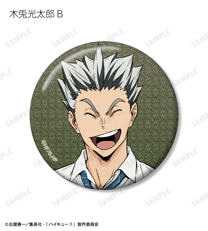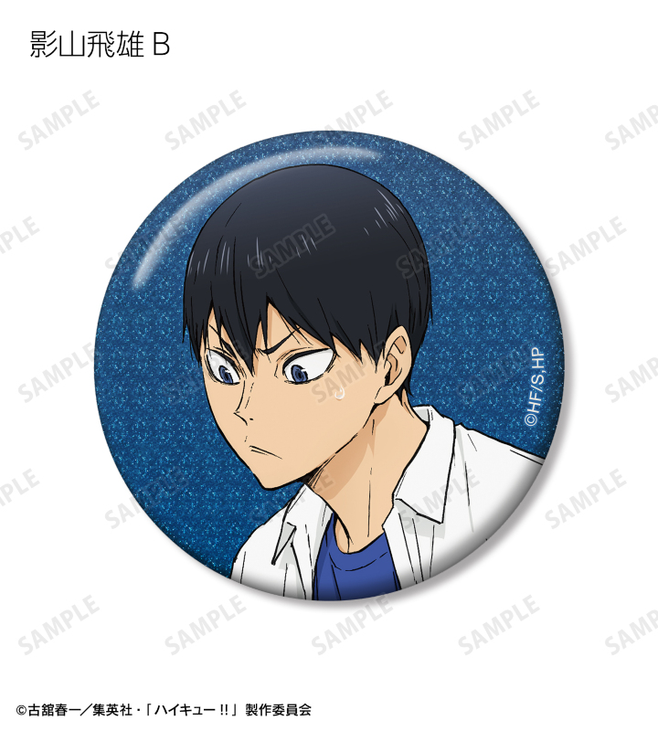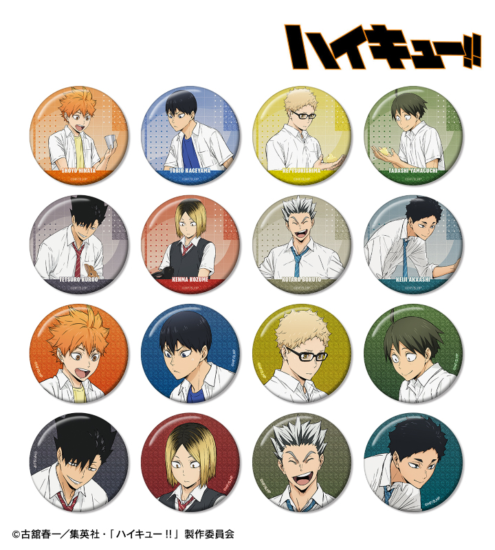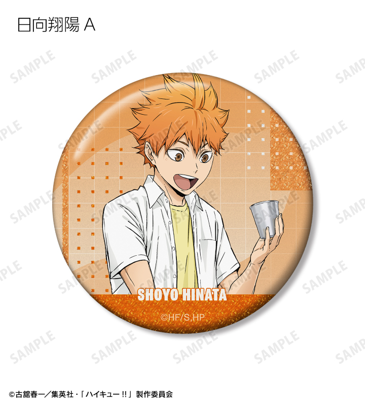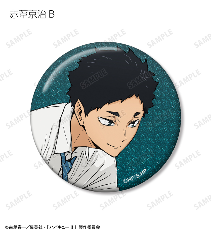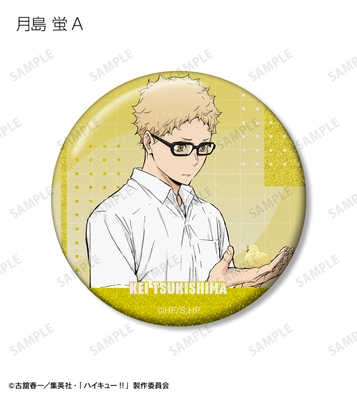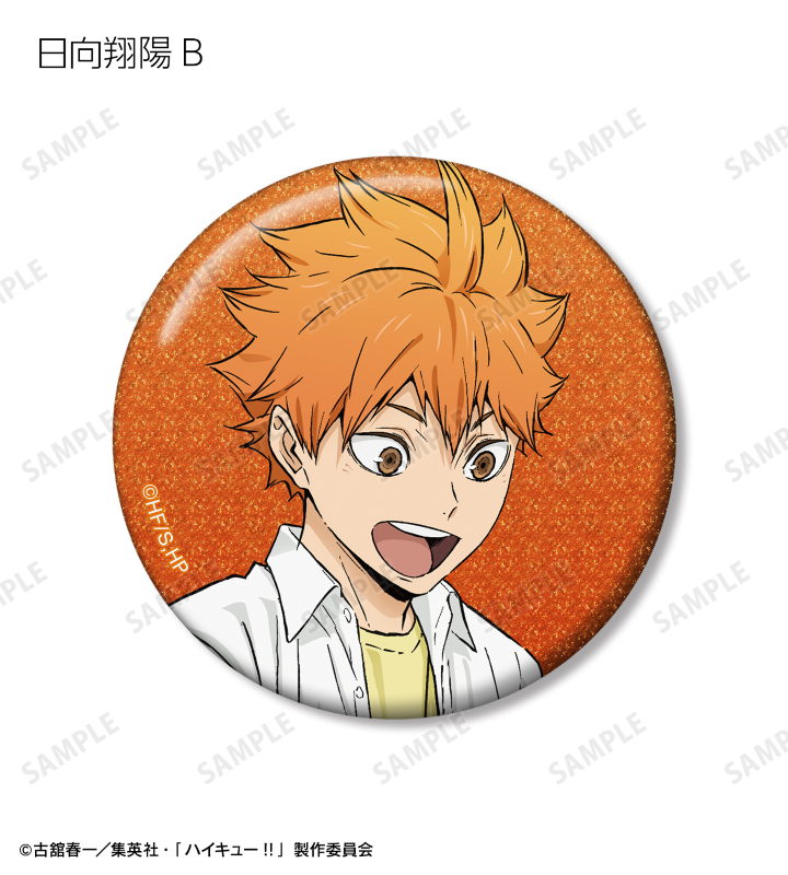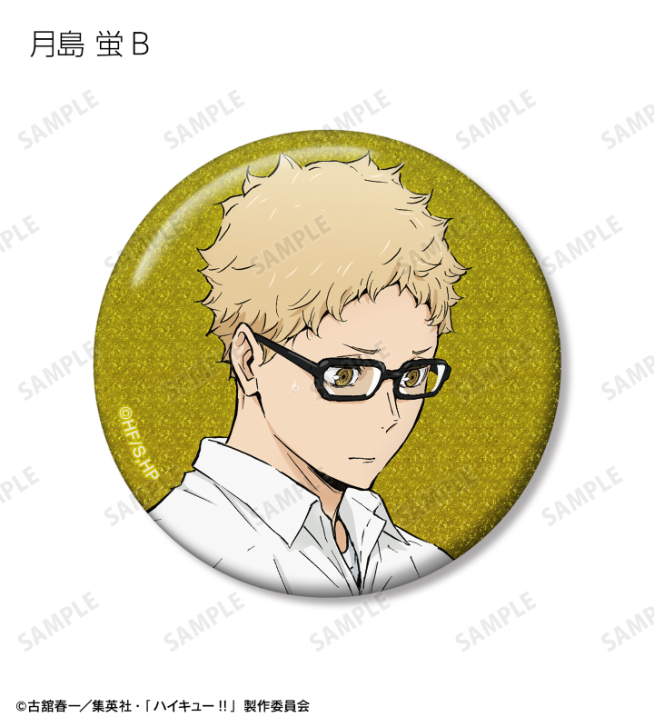 日向翔陽、影山飛雄、月島 蛍、山口 忠、黒尾鉄朗、孤爪研磨、木兎光太郎、赤葦京治の描き下ろしビジュアルをグリッター加工を施した缶バッジに仕上げました。
