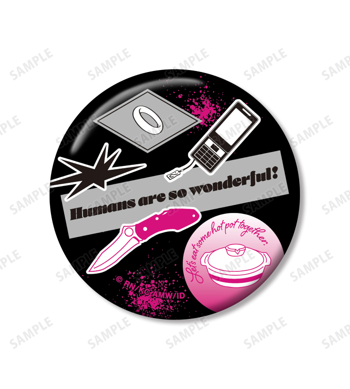 ナイフ、携帯電話、指輪など、折原臨也を象徴するモチーフアイテムと彼の名言をデザインに落とし込み、缶バッジ2個セットに仕上げました。