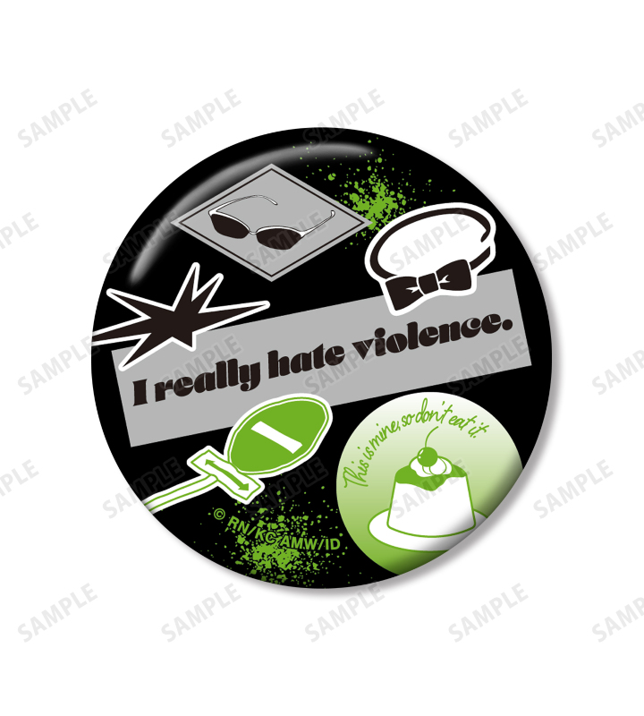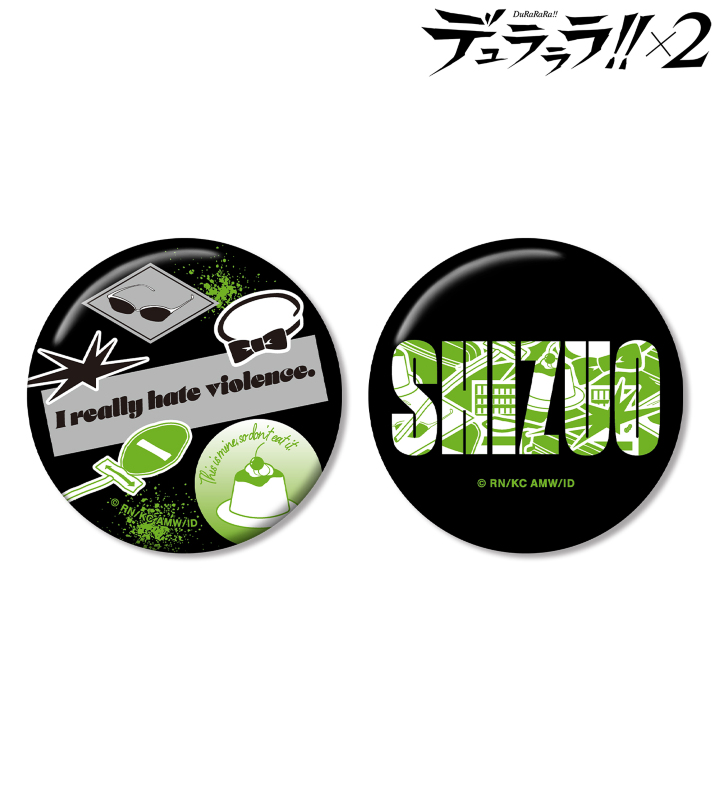 サングラス、蝶ネクタイ、標識など、平和島静雄を象徴するモチーフアイテムと彼の名言をデザインに落とし込み、缶バッジ2個セットに仕上げました。