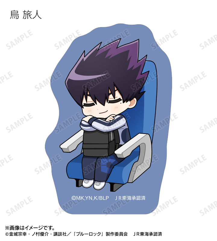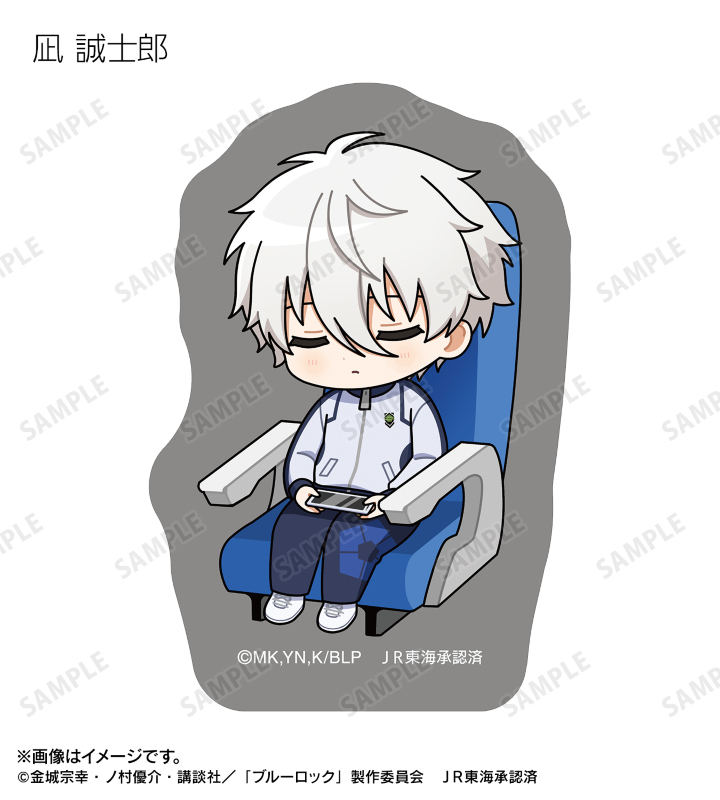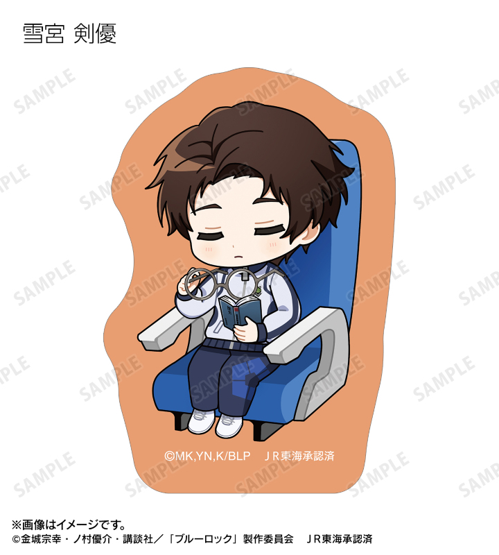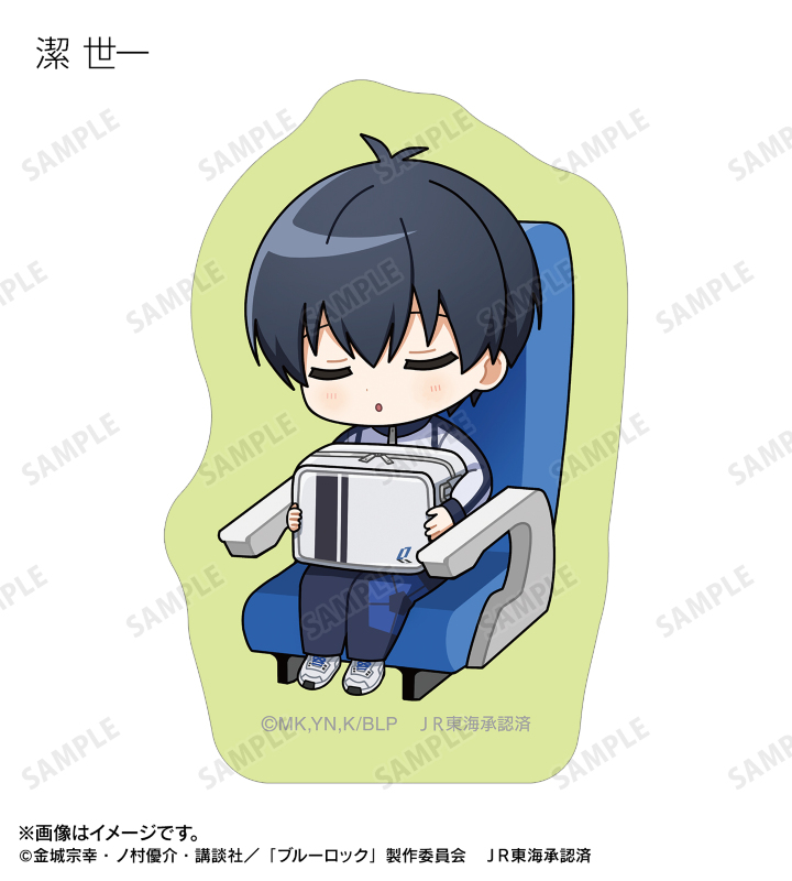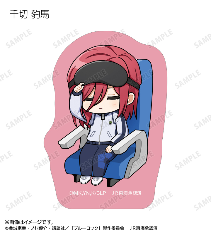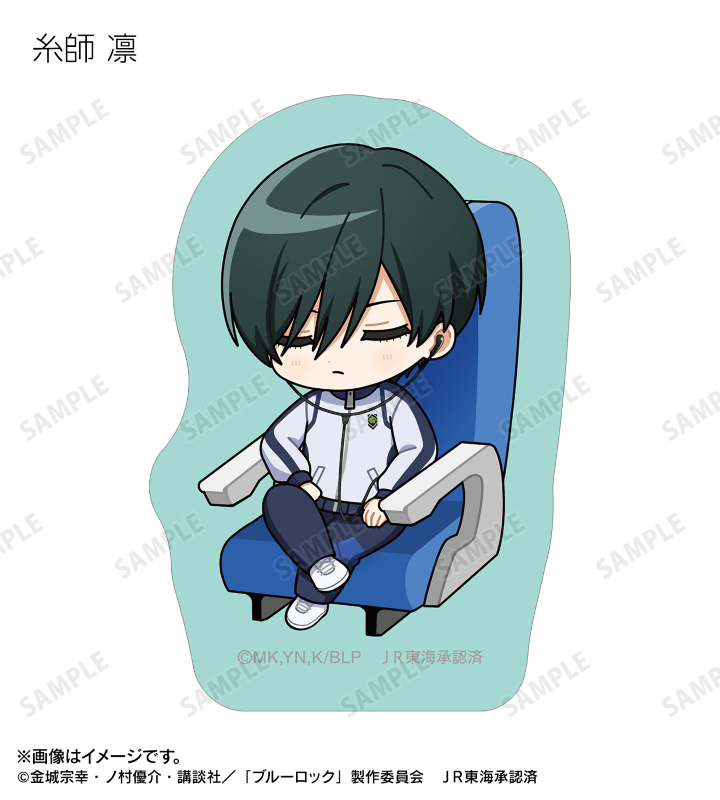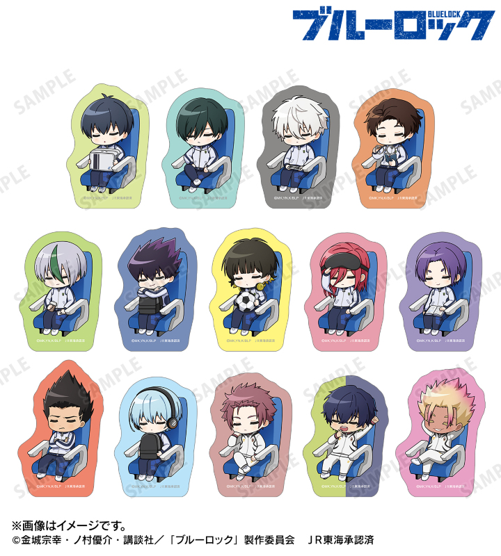 TVアニメ『ブルーロック』×「推し旅/JR東海」のコラボレーションアイテム「ちびキャラ 新幹線でうたたねver. フレークシール」の登場です。