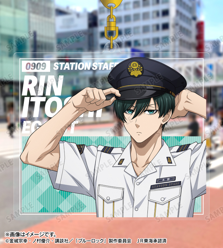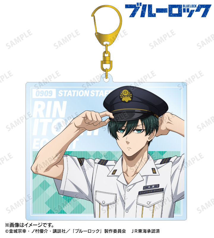 TVアニメ『ブルーロック』×「推し旅/JR東海」のコラボレーションアイテム「描き下ろし 糸師 凛 駅員ver. BIGアクリルキーホルダー」の登場です。