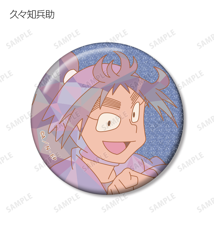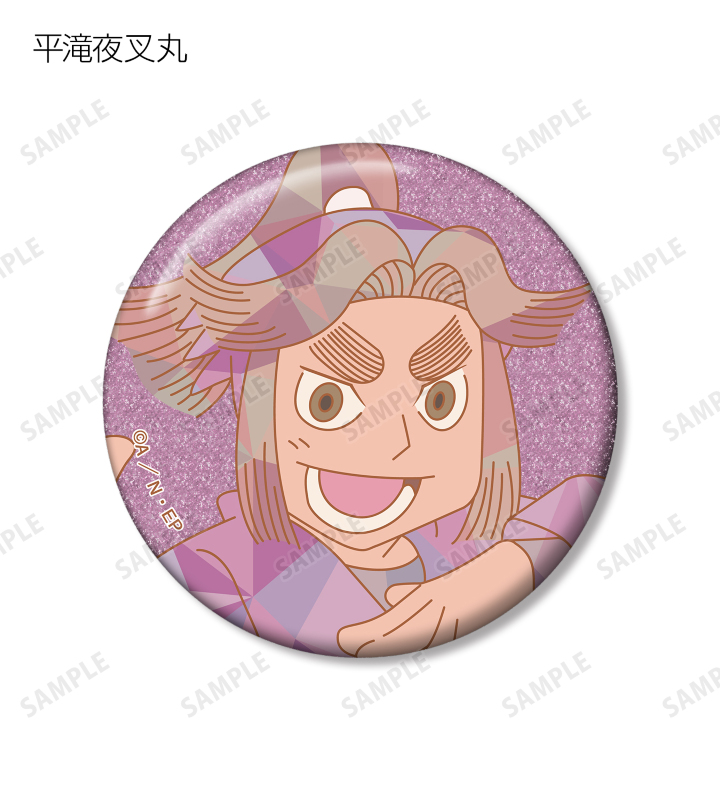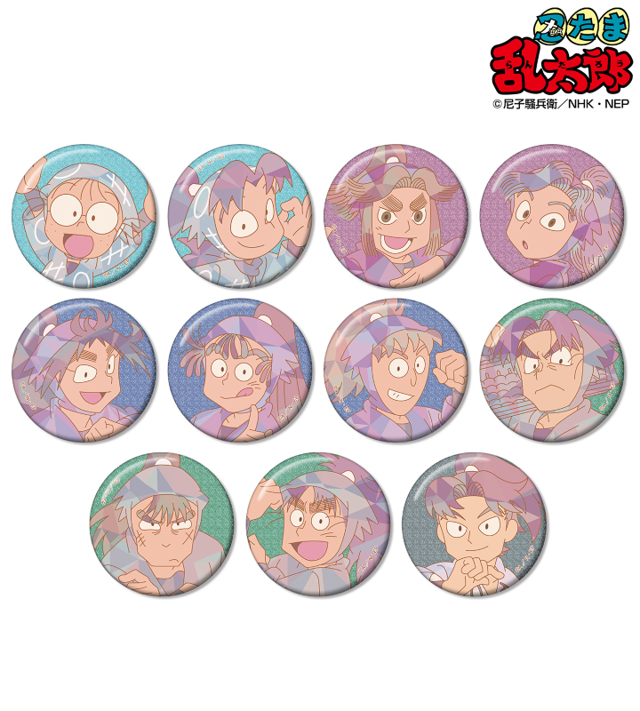 猪名寺乱太郎、摂津のきり丸、平滝夜叉丸、綾部喜八郎、久々知兵助、尾浜勘右衛門、鉢屋三郎、潮江文次郎、中在家長次、七松小平太、山田利吉のイラストにプリズムを散りばめた模様を組み合わせ、グリッター加工を施した缶バッジに仕上げました。