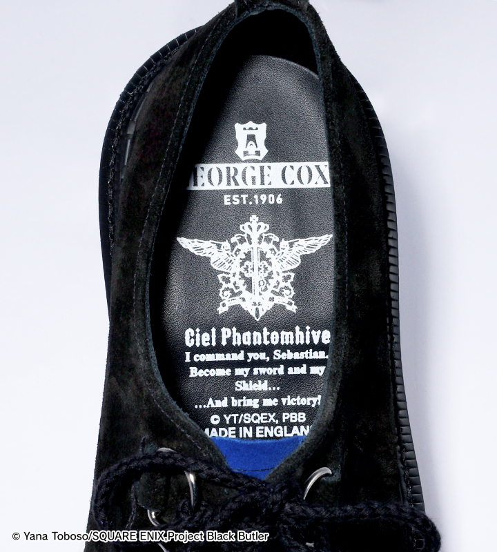インソールにはファントムハイヴ家の紋章と、シエルの名台詞「命令だセバスチャン お前は僕の剣となり盾となれ 僕に勝利を!」を英字でデザインしております。