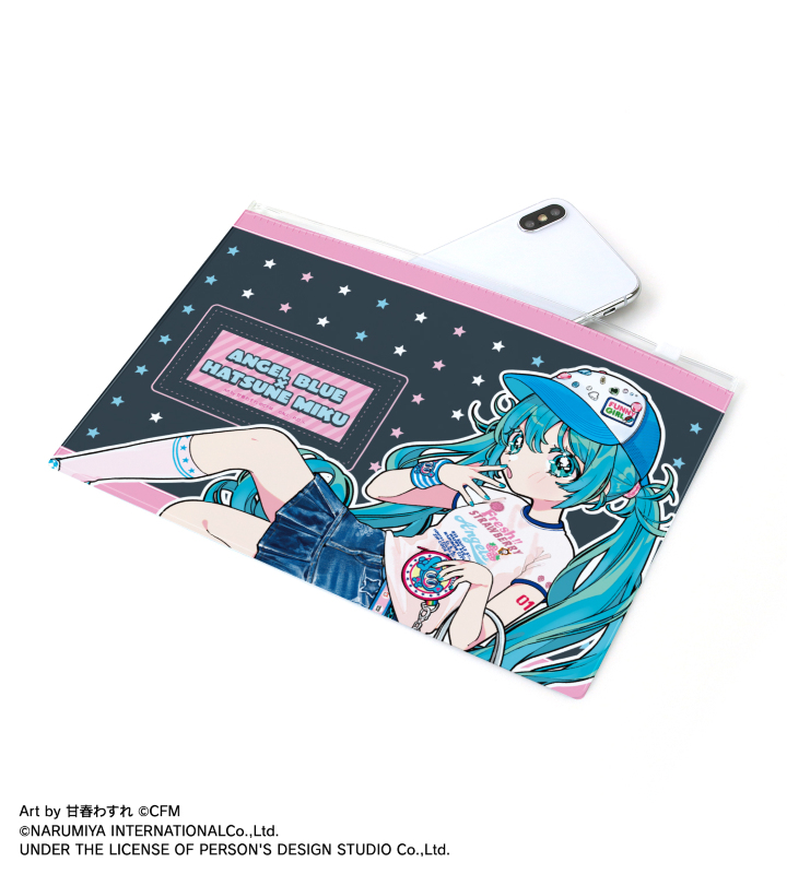 『初音ミク』×「ANGEL BLUE」のコラボレーションアイテム「ANGEL BLUEコラボ 描き下ろし 初音ミク Art by 甘春わすれ ビニールフラットポーチ ver.A」の登場です。
