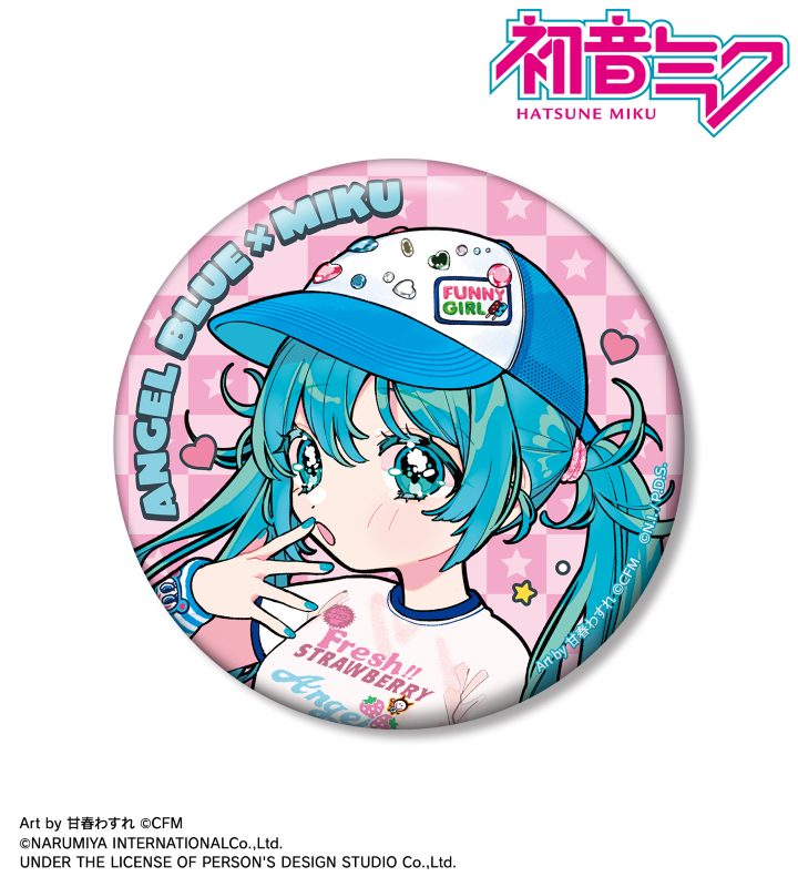 『初音ミク』×「ANGEL BLUE」のコラボレーションアイテム「ANGEL BLUEコラボ 描き下ろし 初音ミク Art by 甘春わすれ 100mm缶バッジ ver.A」の登場です。