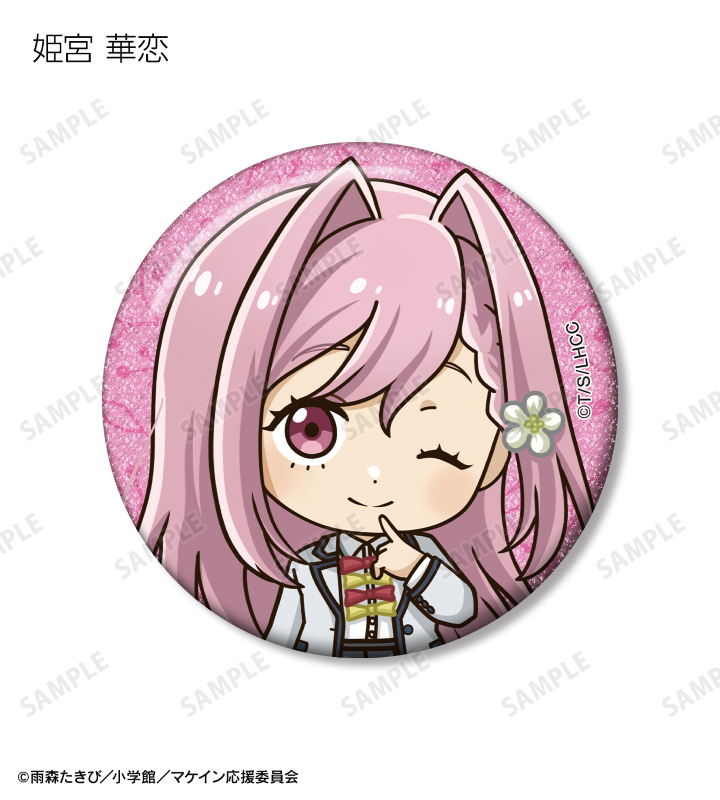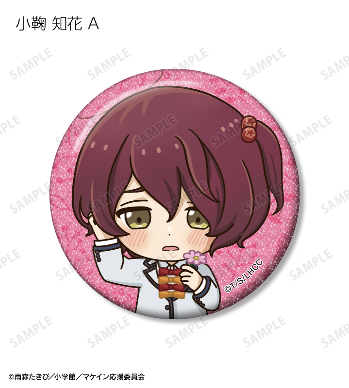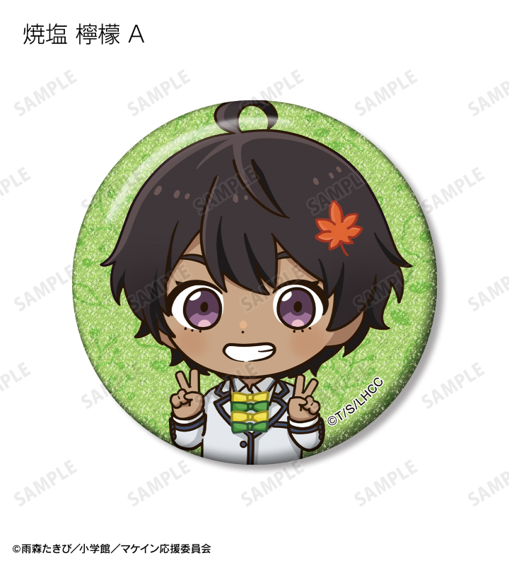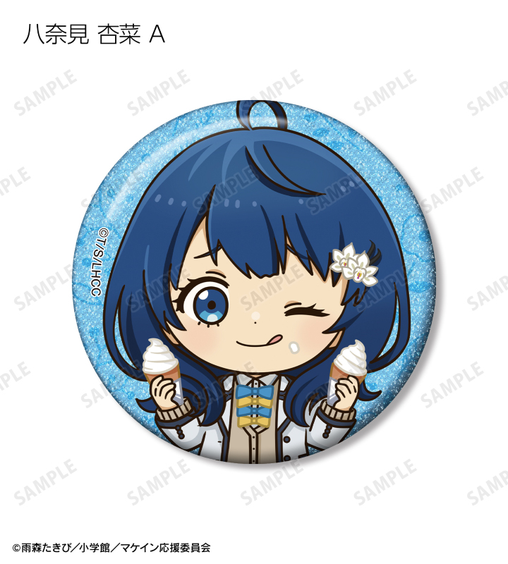温水 和彦、八奈見 杏菜、焼塩 檸檬、小鞠 知花、温水 佳樹、月之木 古都、姫宮 華恋、朝雲 千早、志喜屋 夢子、放虎原 ひばり、馬剃 天愛星の描き起こしちびキャライラストをメインにデザインし、グリッター加工を施した缶バッジに仕上げました。