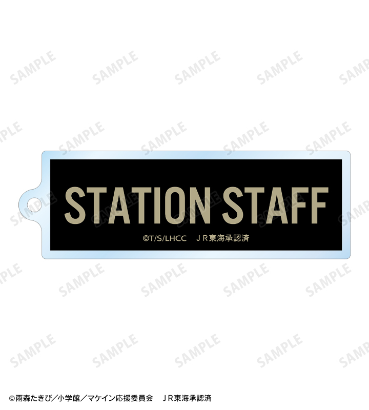 八奈見 杏菜の描き下ろしイラスト、STATION STAFFの文字を、キーホルダーパーツがワイヤー仕様となっている、BIGなアクリルキーホルダーに仕上げました。