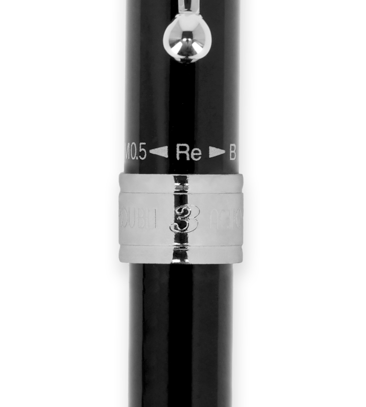 本体内部の機構には切り替えもスピーディな回転式メカを採用しており、回転繰り出し式の油性ボールペン2色(赤・黒 0.7mm)と、回転繰り出し&ノック(キャップスライド)式のシャープペンシル0.5mmが一体となった多機能筆記具です。