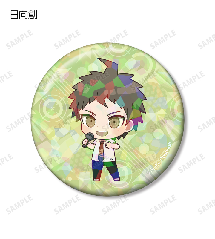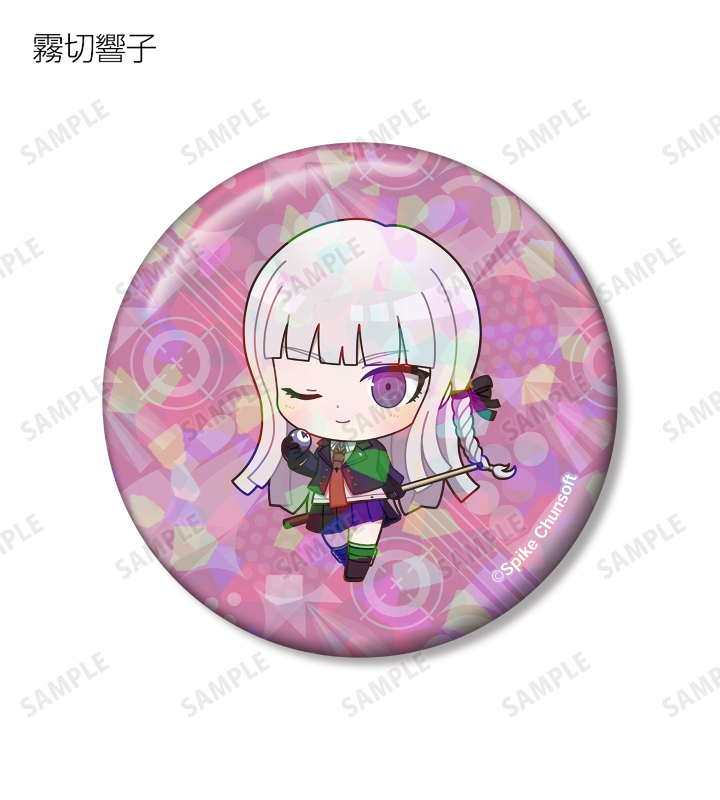 苗木誠、舞園さやか、霧切響子、江ノ島盾子、日向創、狛枝凪斗、七海千秋、澪田唯吹、赤松楓、王馬小吉、キーボ、最原終一の描き起こしちびキャライラストをメインにデザインし、ホログラム加工を施した缶バッジに仕上げました。