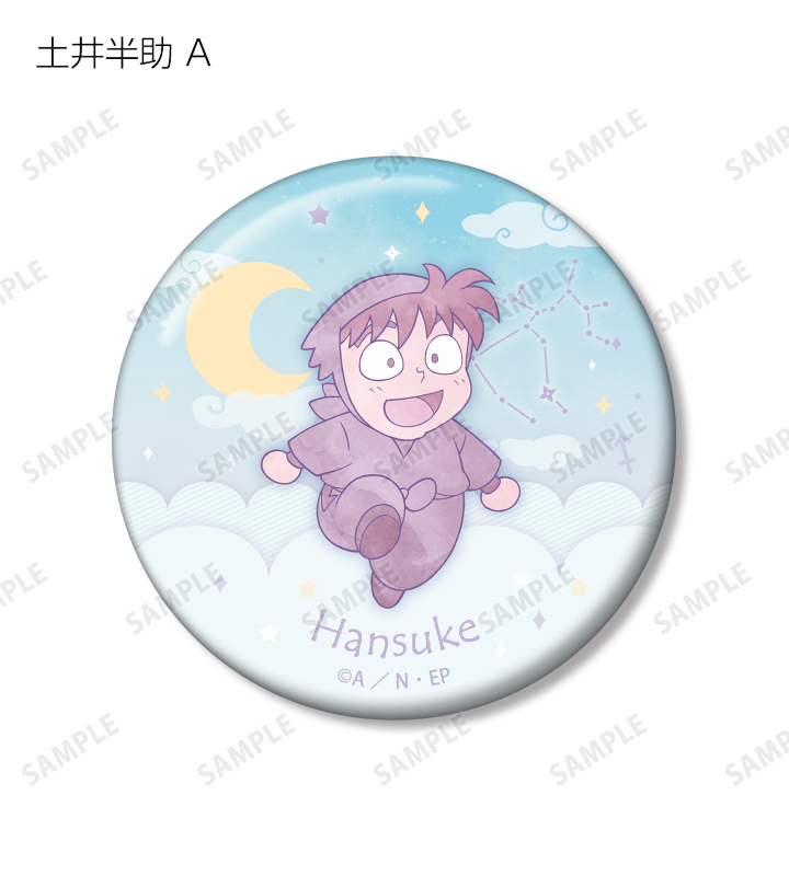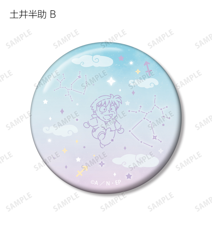 土井半助のちびキャライラストと星座を組み合わせて、缶バッジ2個セットに仕上げました。