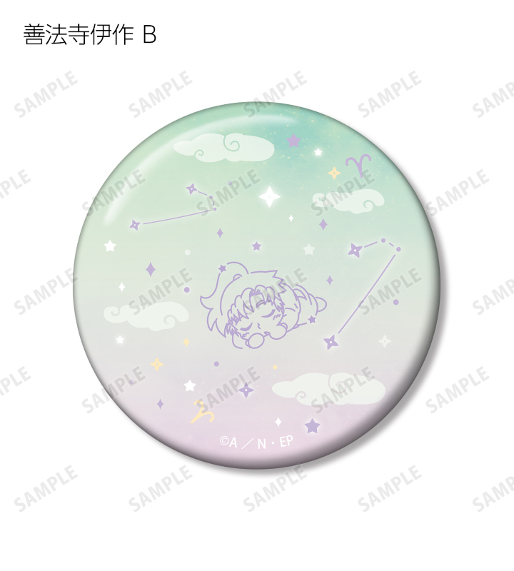 善法寺伊作のちびキャライラストと星座を組み合わせて、缶バッジ2個セットに仕上げました。