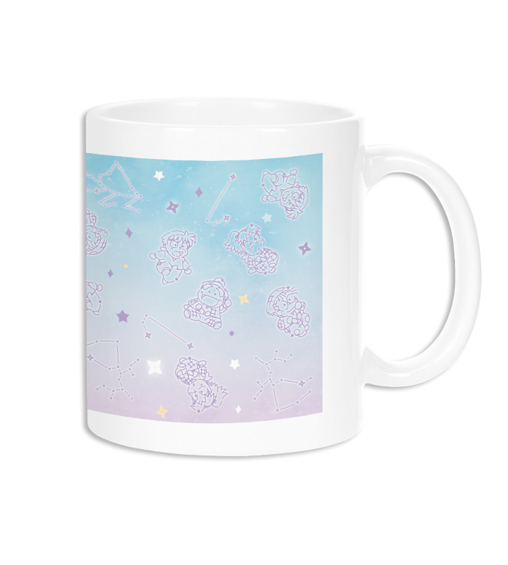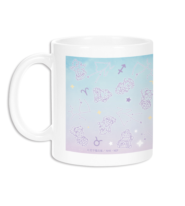 猪名寺乱太郎、摂津のきり丸、福富しんべヱ、土井半助のちびキャライラストと星座を組み合わせてマグカップに仕上げました。