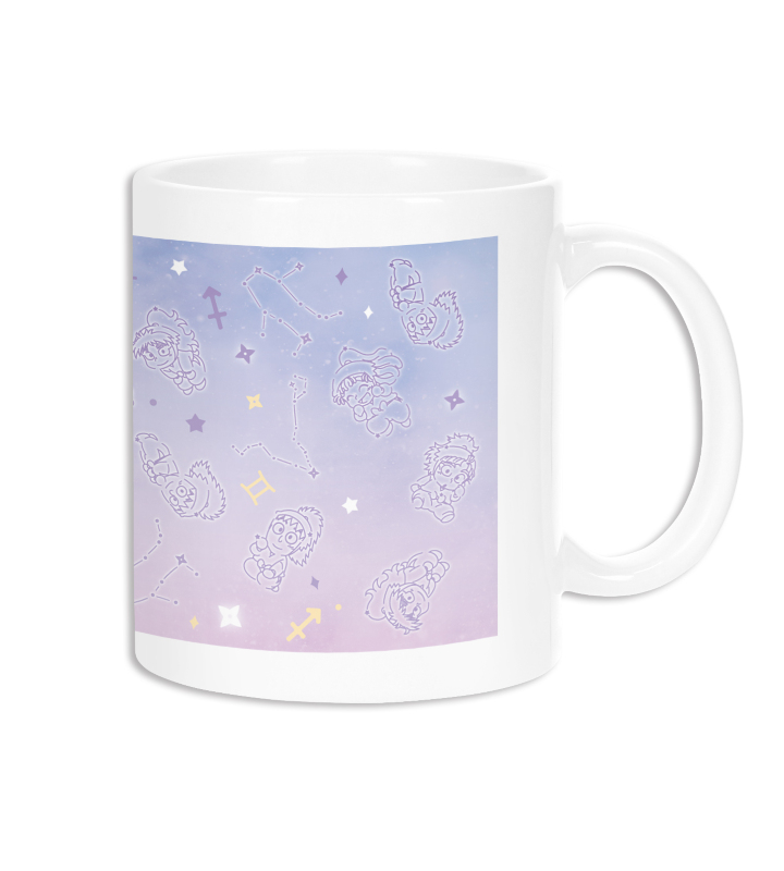 久々知兵助、尾浜勘右衛門、不破雷蔵、鉢屋三郎、竹谷八左ヱ門のちびキャライラストと星座を組み合わせてマグカップに仕上げました。