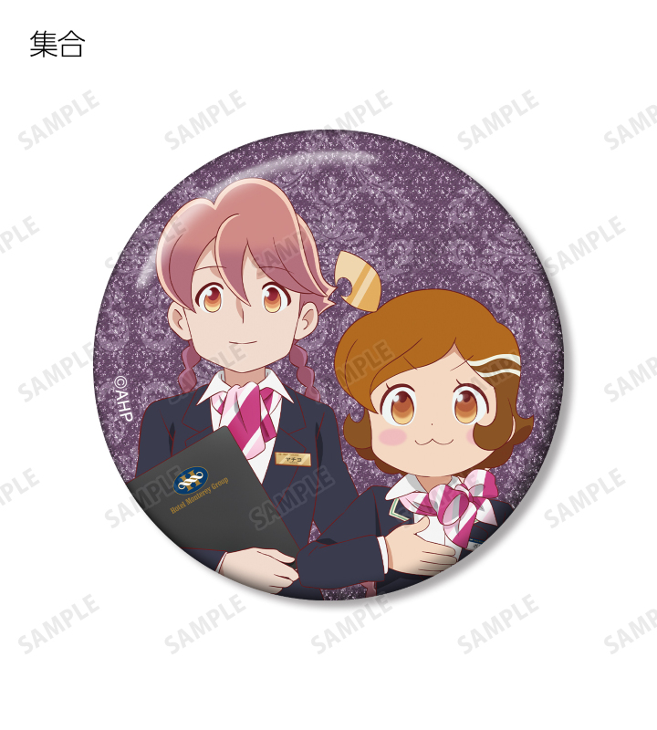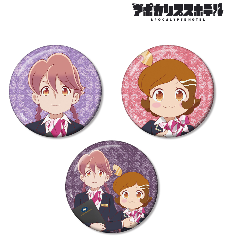 TVアニメ「アポカリプスホテル」×「ホテルモントレ銀座」のコラボレーションアイテム「描き下ろし ホテルモントレ制服ver. グリッター缶バッジ3個セット」の登場です。