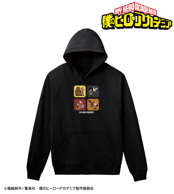 オールマイト、相澤消太、エンデヴァー、ホークスの描き起こしちびキャラビジュアルをメインにデザインし、パーカーに仕上げました。