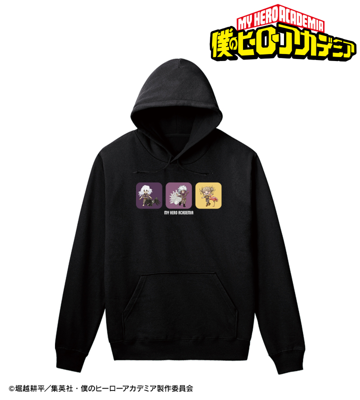 死柄木弔、荼毘、トガヒミコの描き起こしちびキャラビジュアルをメインにデザインし、パーカーに仕上げました。