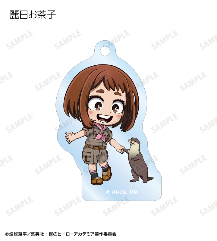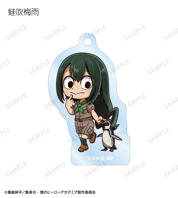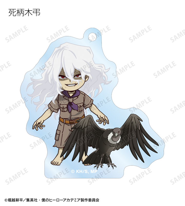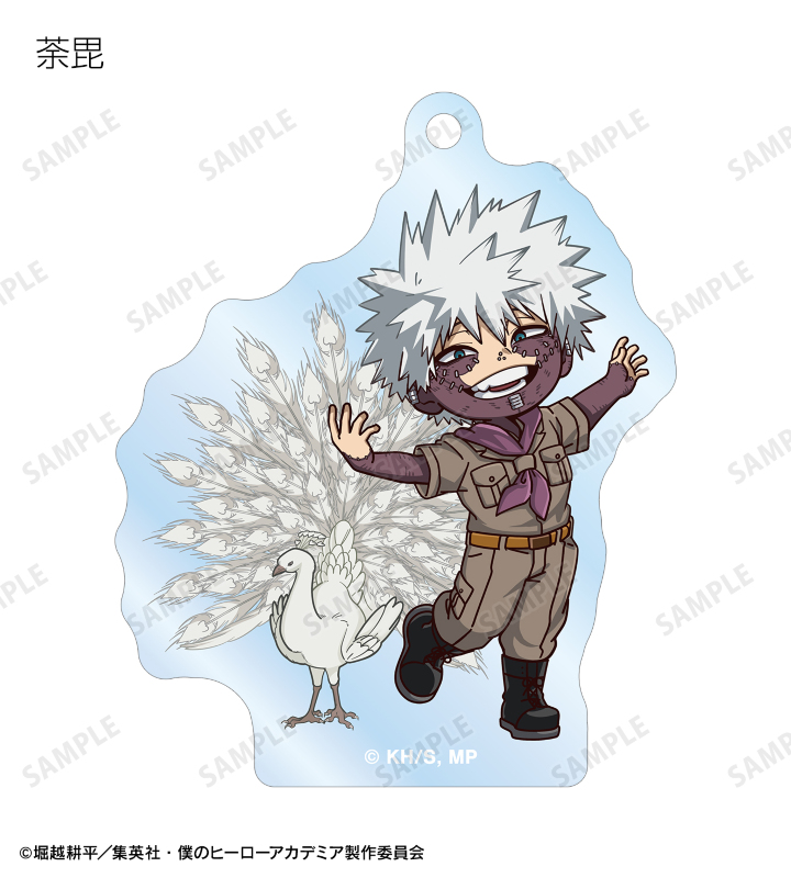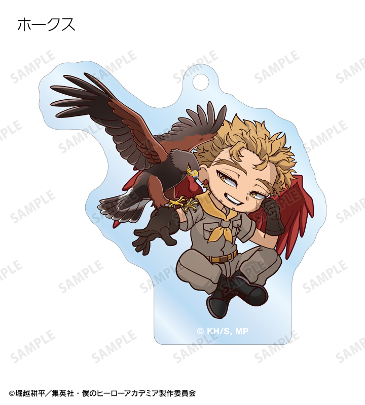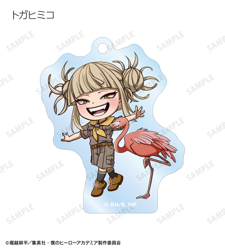 緑谷出久、爆豪勝己、麗日お茶子、轟焦凍、蛙吹梅雨、切島鋭児郎、上鳴電気、耳郎響香、心操人使、オールマイト、相澤消太、エンデヴァー、ホークス、死柄木弔、荼毘、トガヒミコの描き起こしちびキャラビジュアルをメインにデザインし、アクリルキーホルダーに仕上げました。