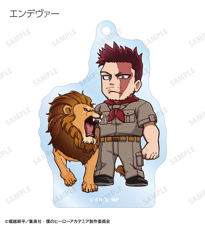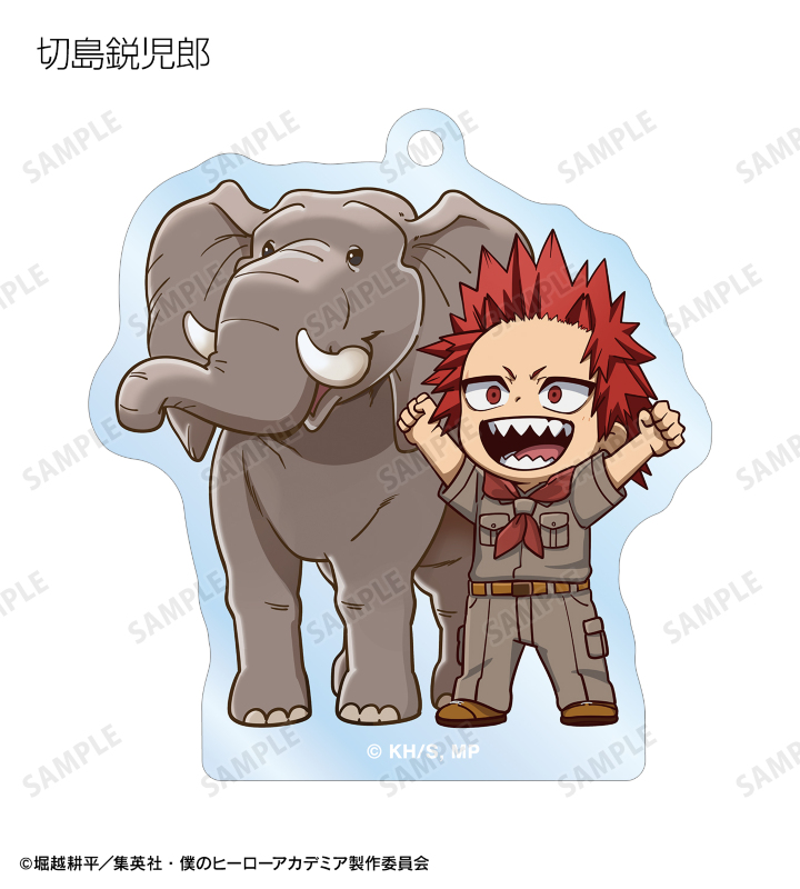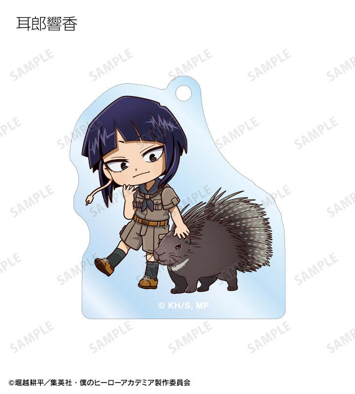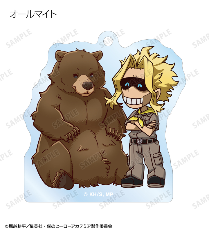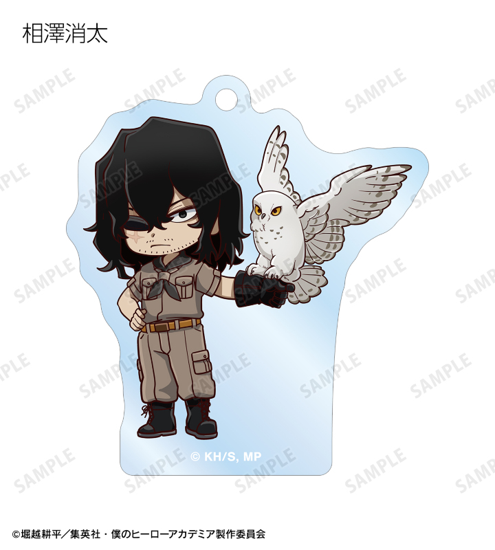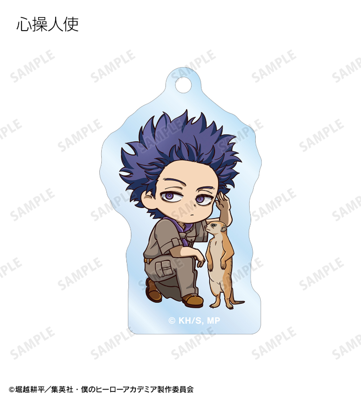 緑谷出久、爆豪勝己、麗日お茶子、轟焦凍、蛙吹梅雨、切島鋭児郎、上鳴電気、耳郎響香、心操人使、オールマイト、相澤消太、エンデヴァー、ホークス、死柄木弔、荼毘、トガヒミコの描き起こしちびキャラビジュアルをメインにデザインし、アクリルキーホルダーに仕上げました。