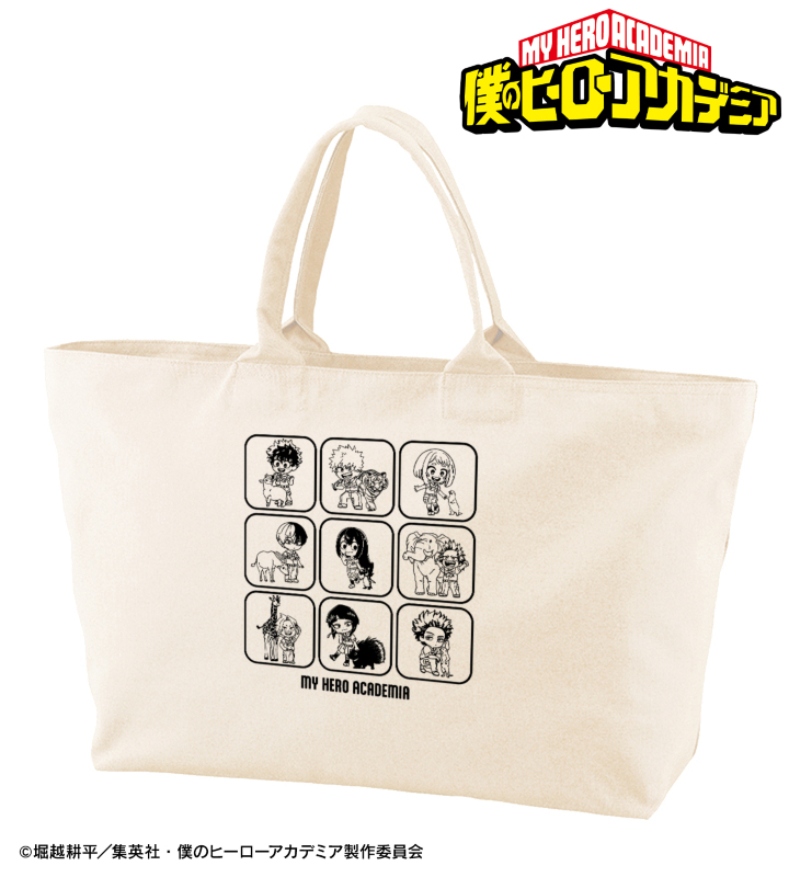 緑谷出久、爆豪勝己、麗日お茶子、轟焦凍、蛙吹梅雨、切島鋭児郎、上鳴電気、耳郎響香、心操人使の描き起こしちびキャラビジュアルをメインにデザインし、BIGなジップトートバッグに仕上げました。