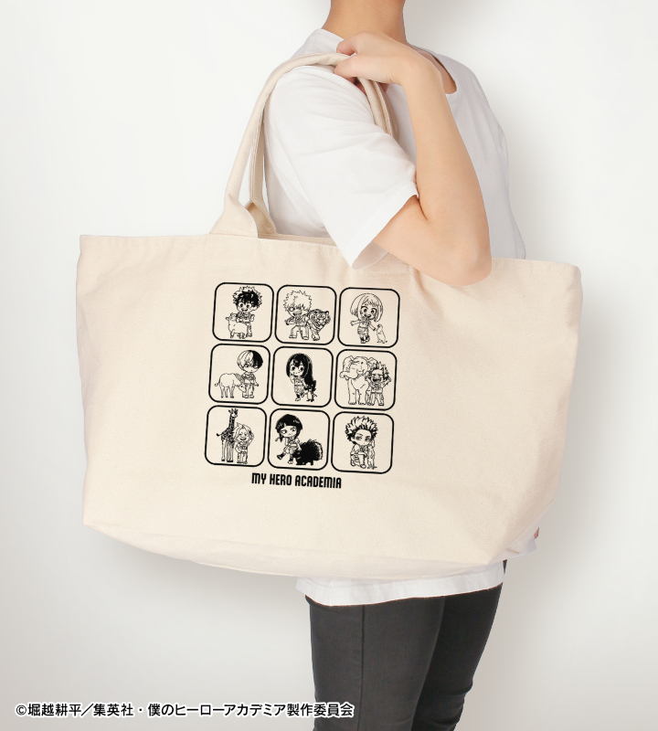TVアニメ『僕のヒーローアカデミア』×「東武動物公園」のコラボレーションアイテム「集合 ちびキャラ 動物とのふれあいver. BIGジップトートバッグ ver.A」の登場です。