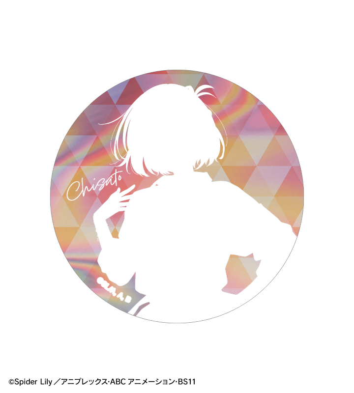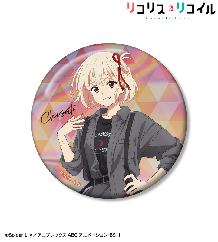 錦木千束の描き下ろしイラストを、オーロラ加工を施した缶バッジに仕上げました。