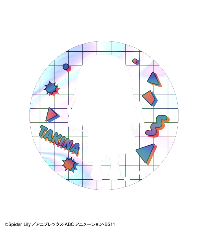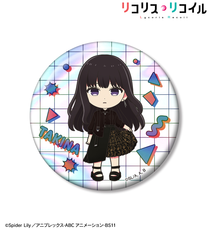 TVアニメ「リコリス・リコイル」×「meagratia」のコラボレーションアイテム「meagratiaコラボ 井ノ上たきな ちびキャラ 75mmオーロラ缶バッジ ver.A」の登場です。