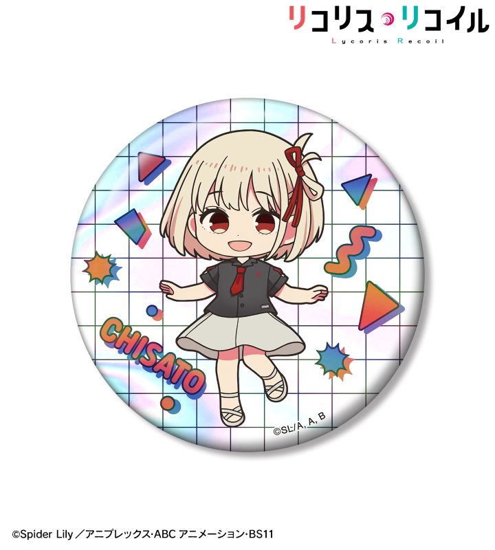 TVアニメ「リコリス・リコイル」×「meagratia」のコラボレーションアイテム「meagratiaコラボ 錦木千束 ちびキャラ 75mmオーロラ缶バッジ ver.B」の登場です。