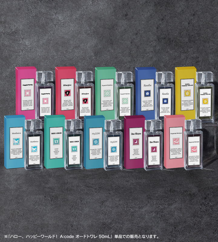 『BanG Dream!』×「A:code」のコラボレーションアイテム「ハロー、ハッピーワールド! A:code オードトワレ 50mL」の登場です。