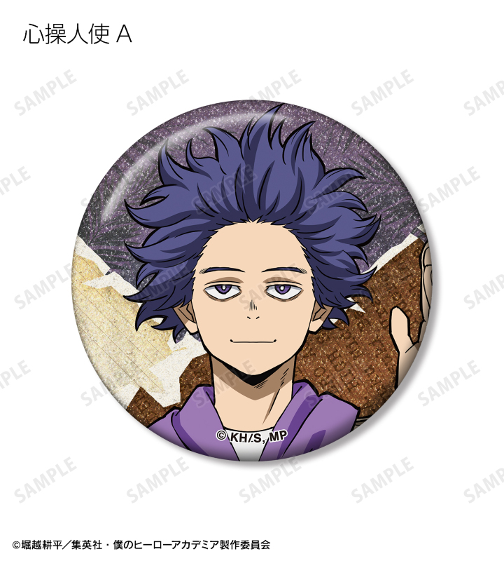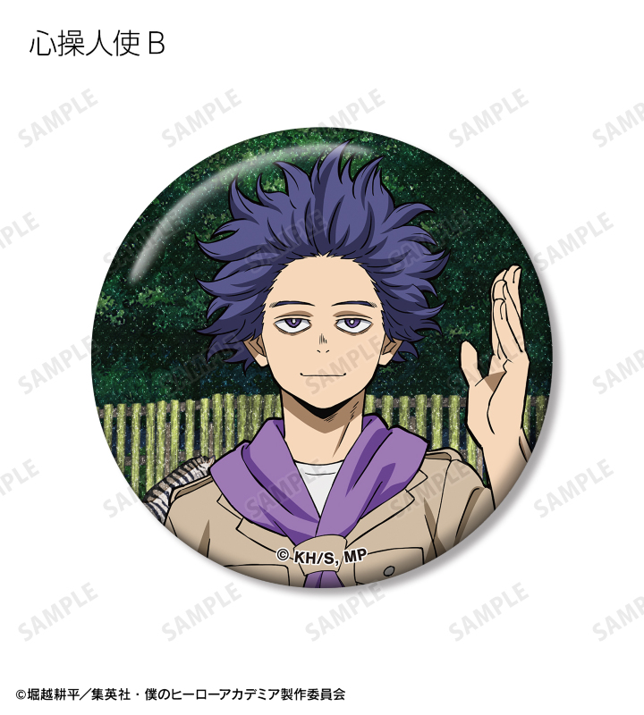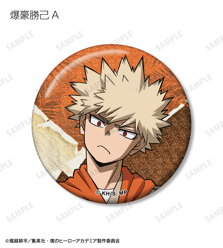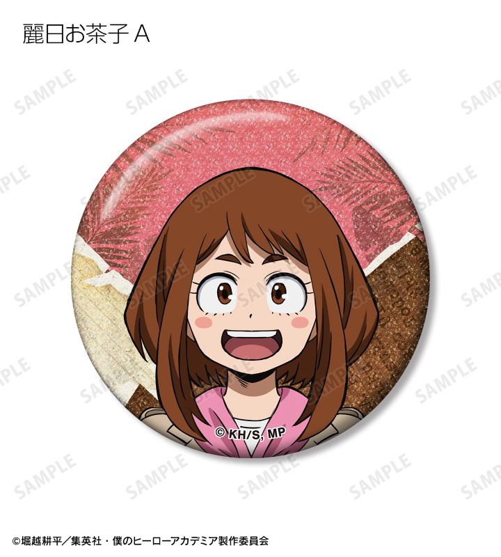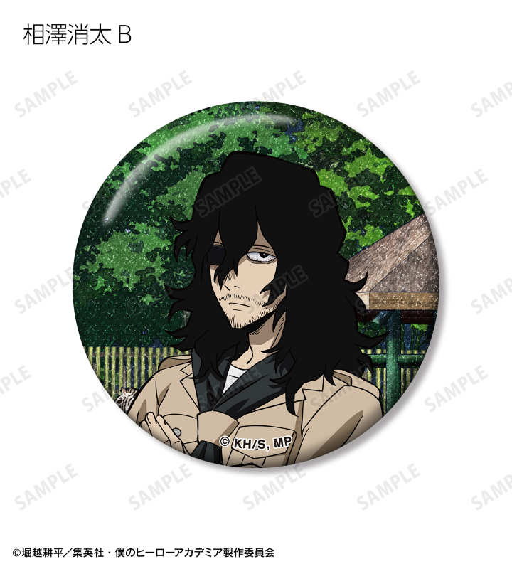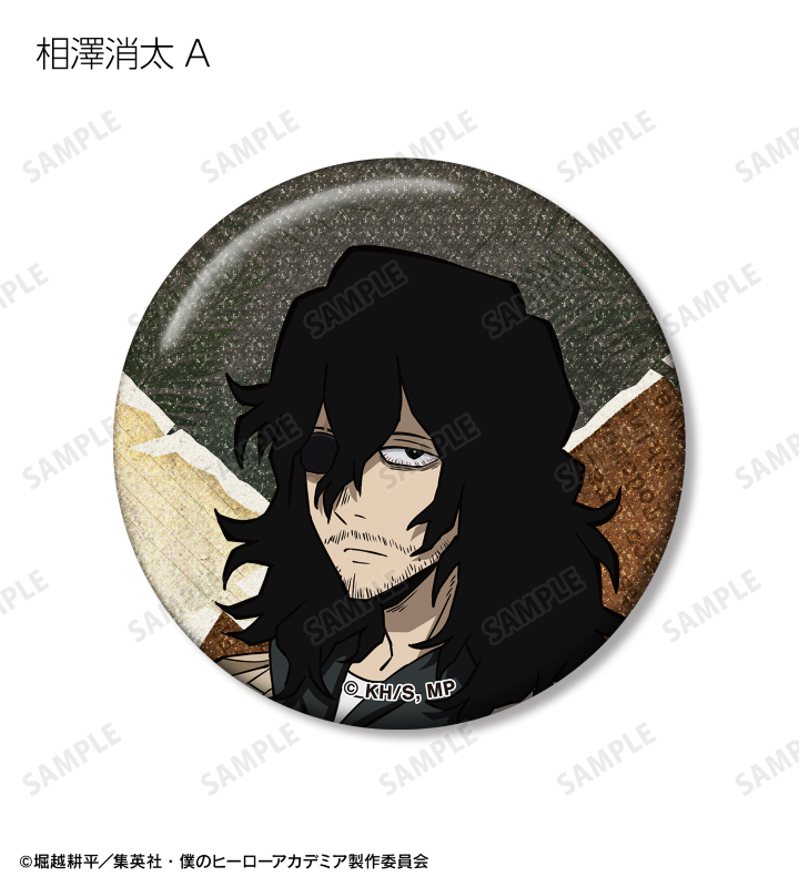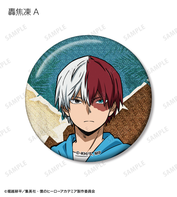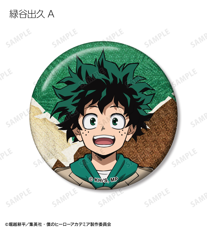 緑谷出久、爆豪勝己、麗日お茶子、轟焦凍、心操人使、相澤消太の描き下ろしビジュアルをグリッター加工を施した缶バッジに仕上げました。