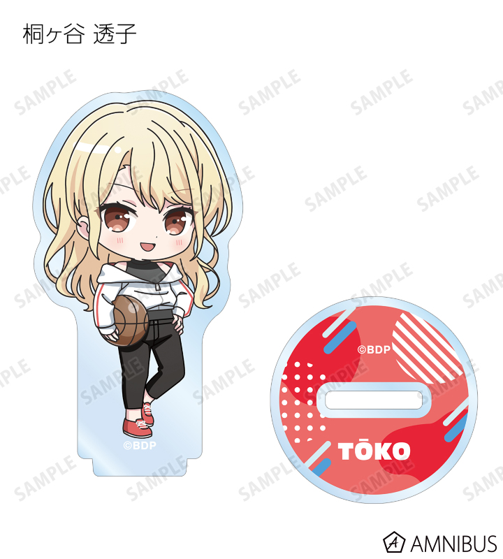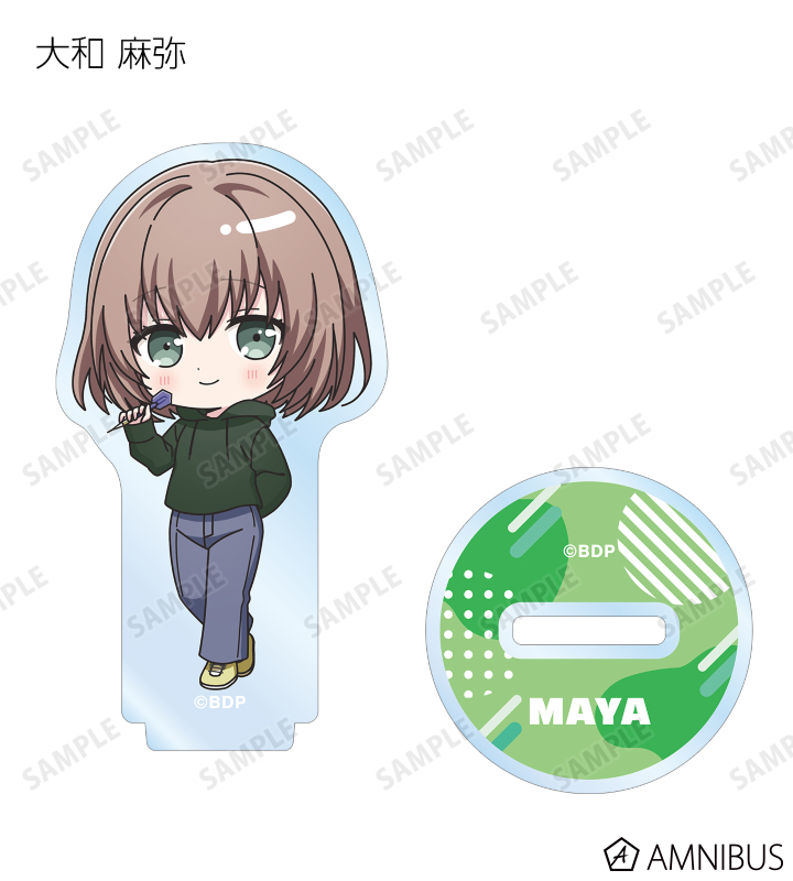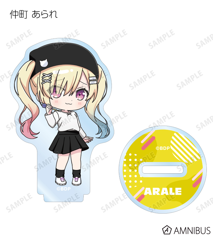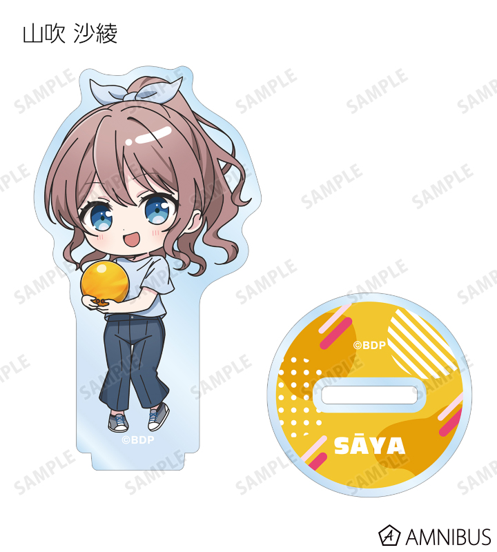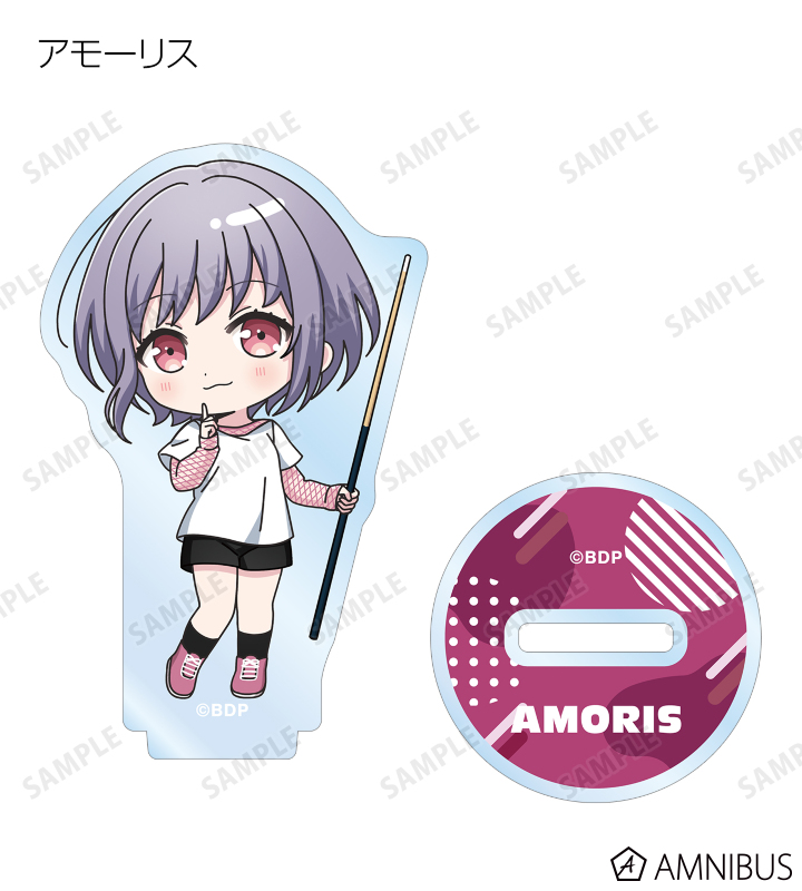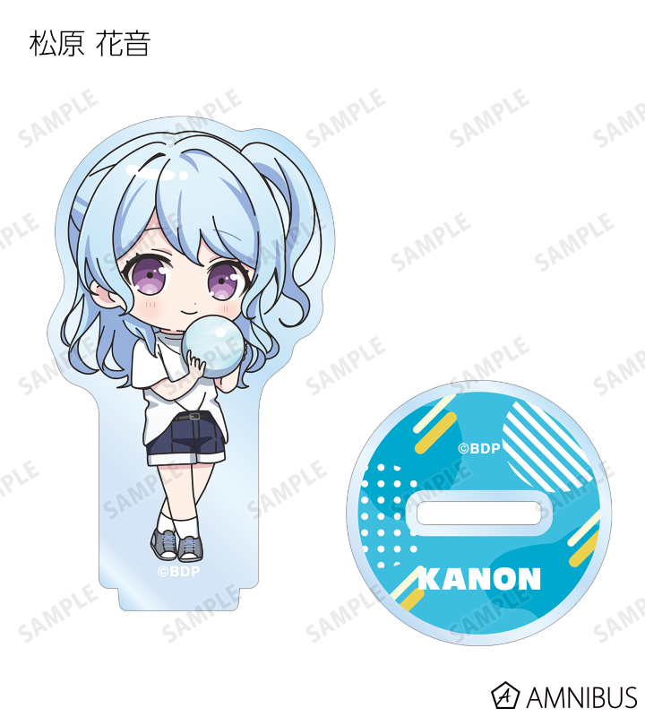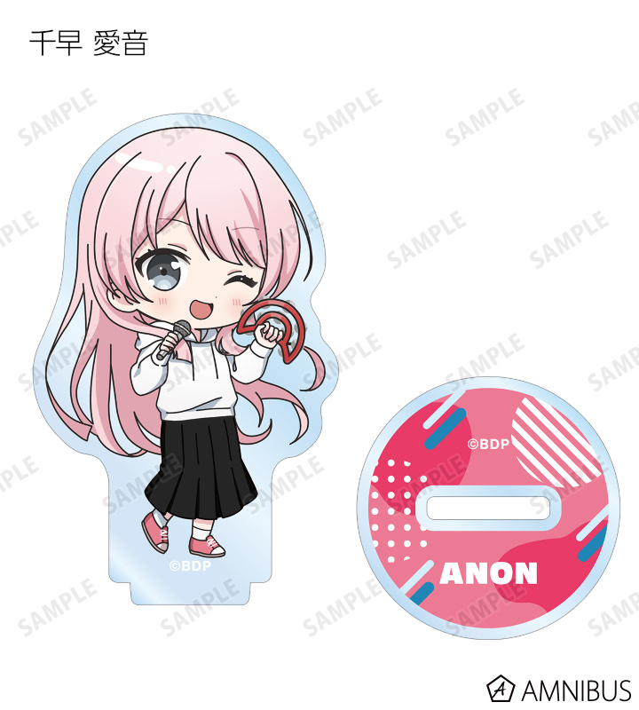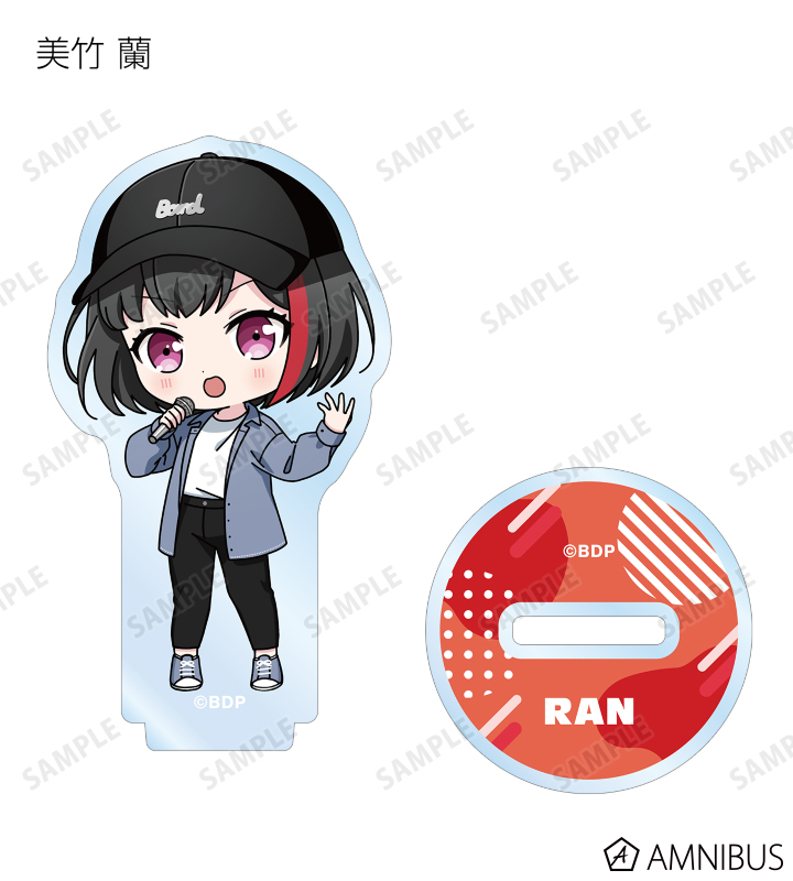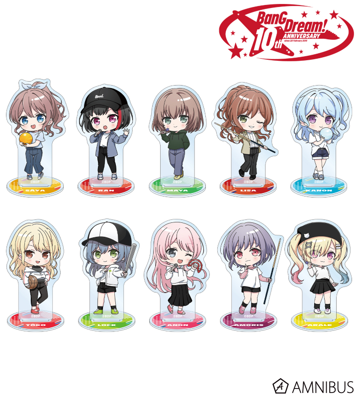 山吹 沙綾、美竹 蘭、大和 麻弥、今井 リサ、松原 花音、桐ヶ谷 透子、ロック、千早 愛音、アモーリス、仲町 あられの描き起こしちびキャライラストをメインにデザインし、アクリルスタンドに仕上げました。